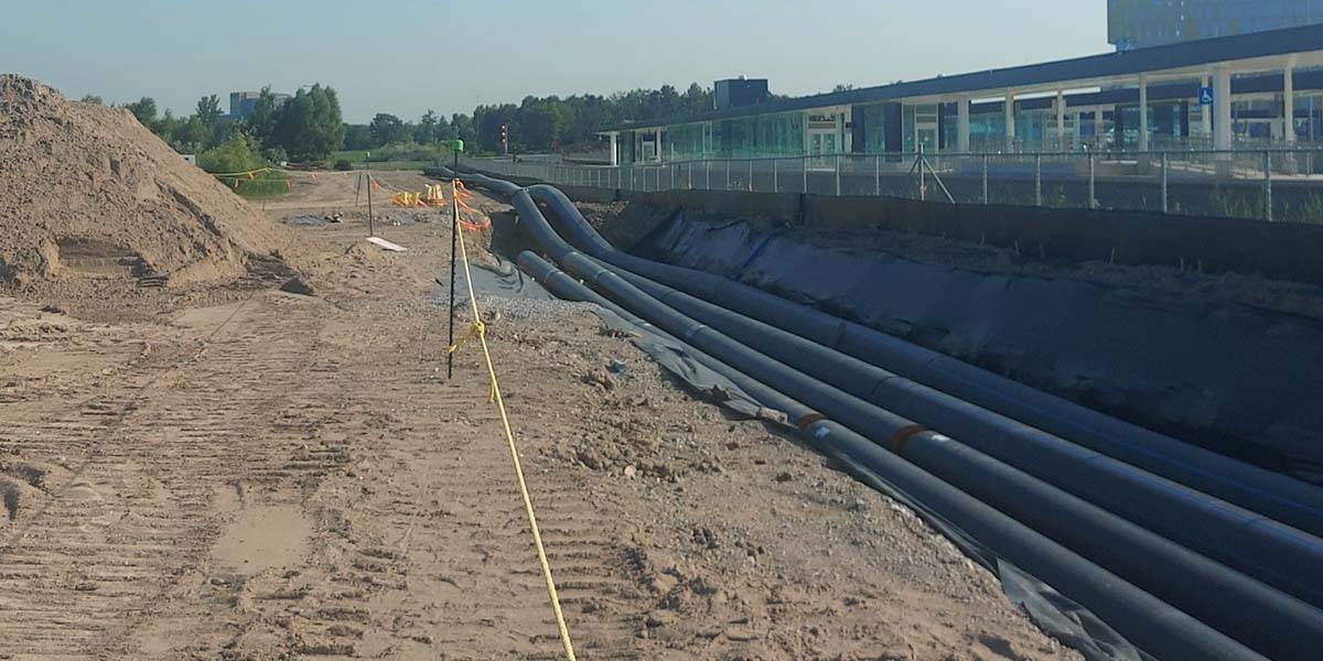 This distribution piping project involved the installation of 1.6 km of two (2) 350mm pre-insulated EN253 hot water pipes, and two (2) HDPE DR11 cooling pipes in Markham’s downtown core. This pipe routing included: